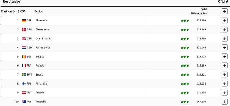 En la competición por equipos, Alemania volvió a brillar, llevándose la medalla de oro con un total de 237.546 puntos. Dinamarca se quedó con la plata 235.730 y Gran Bretaña con el bronce 234.500. El equipo mexicano, aunque luchó con determinación, finalizó en la 13ª posición, sin poder clasificar para la final, pero dejando claro su potencial para futuras competiciones.